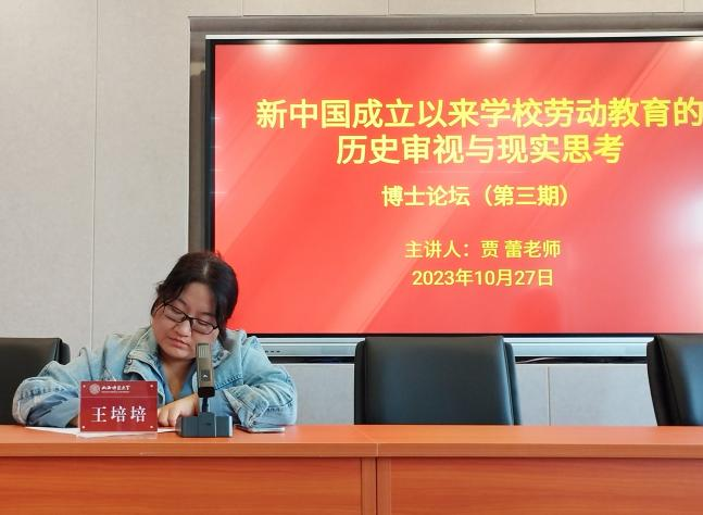 接着,贾蕾老师作了题为《新中国成立以来学校劳动教育的历史审视与现实思考》的报告。她以新中国成立为背景,从文章的选题缘由、写作思路出发,着重分析为什么要开展学校劳动教育,怎样开展学校劳动教育,讲述了学校劳动教育的内容、途径、教学目标等重要内容,同时指出了学校劳动教育的发展现状以及存在的问题。她表示,学校劳动教育与社会现实状况、与中央导向密切相关,应促进强国与育人的深度融合,理解中华民族伟大复兴与学校劳动教育的紧密联系,弘扬新时代劳模精神、劳动精神和工匠精神,进行创造性劳动教育,把新时代劳动教育的育人效果与育人价值鲜明的体现出来,让学生成为堪当民族复兴大任的时代新人,使学生成为社会主义建设者和接班人。